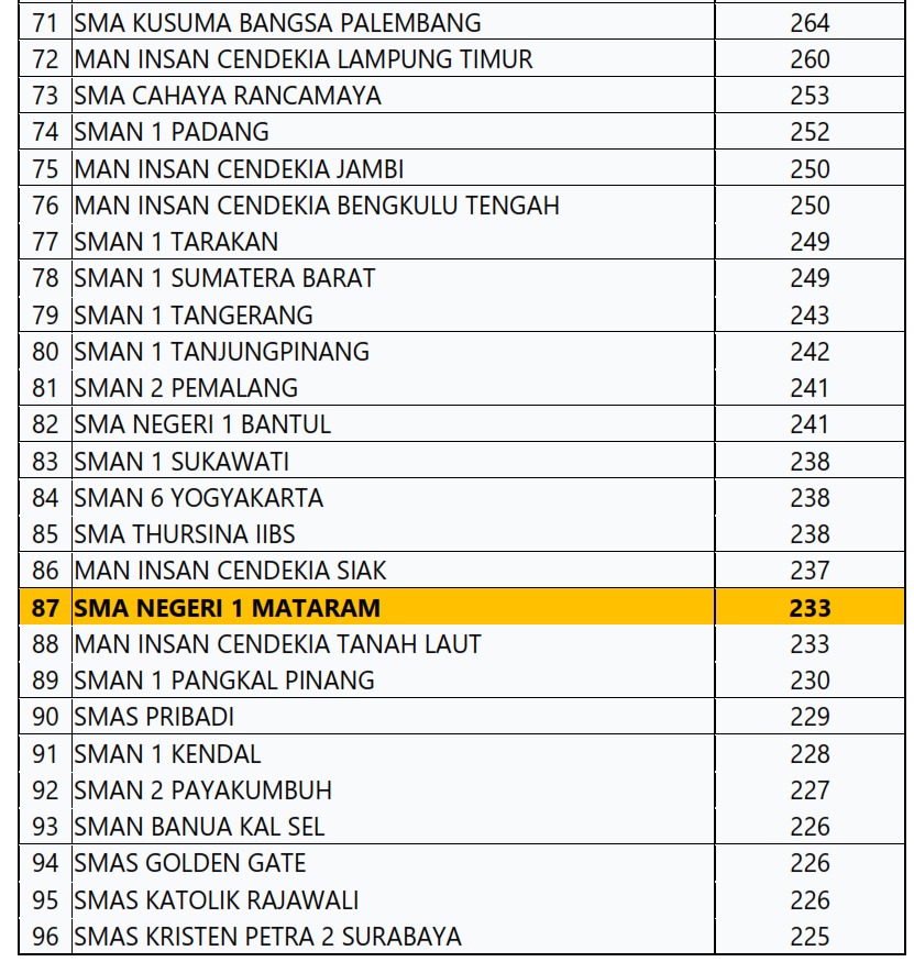 SMAN 1 Mataram Masuk 100 Besar SMA Terbaik Indonesia Tahun 2026