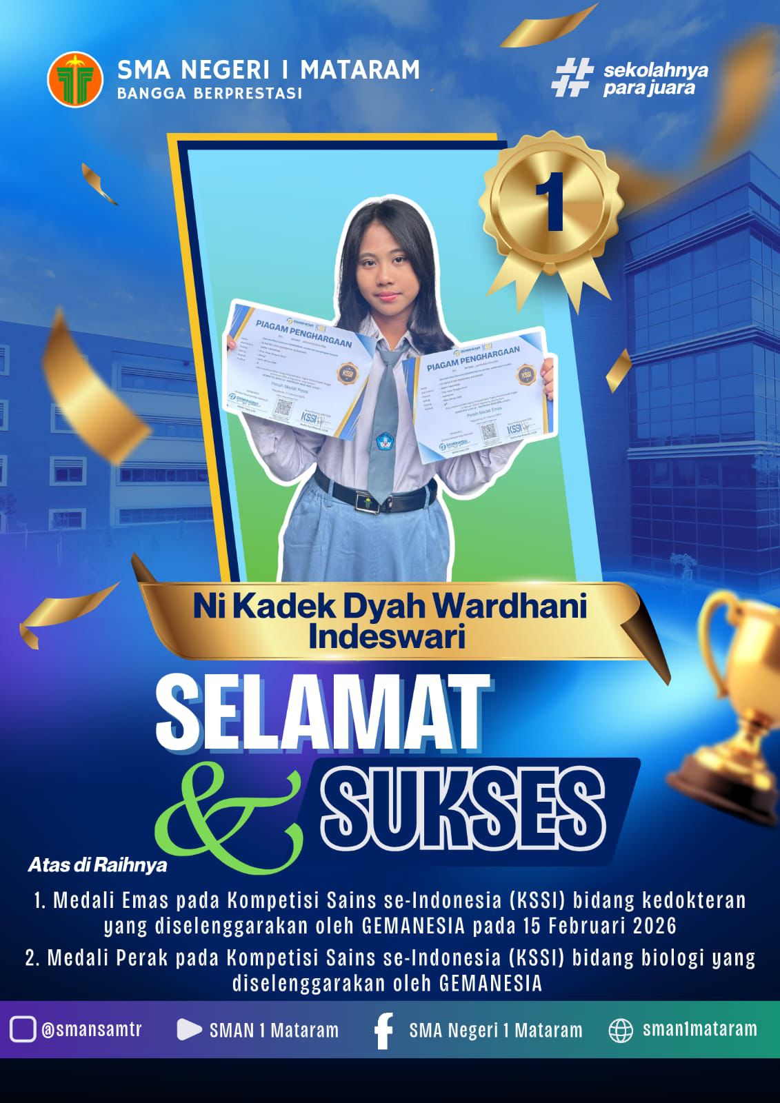 Medali Perak Senior High School Olympiad (SHSO) Bidang Biologi Tingkat Provinsi NTB yang diselenggarakan oleh POSI di Universitas Muhammadiyah Mataram secara luring pada 1 Februari 2026
